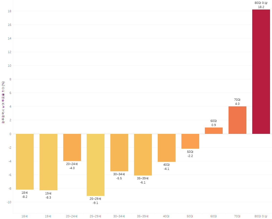 다만, 80세 이상에서는 건강이나 이동의 어려움 등으로 인해 투표율이 다소 하락하는 경향이 있는데, 이는 전국 대부분의 도시에서 관찰되는 공통된 현상입니다.