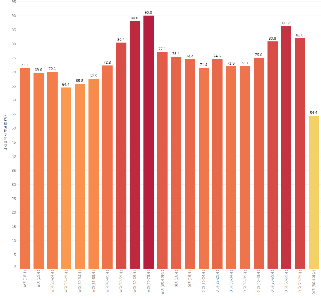 대전의 60대 이상 유권자는 대체로 80% 이상의 높은 투표율을 기록합니다. 특히 70대에서는 80~85%에 육박하는 경우가 많으며, 이는 오랜 정치 참여 습관과 지역 사회 네트워크의 결집력이 크게 작용한 결과입니다. - 특이점: