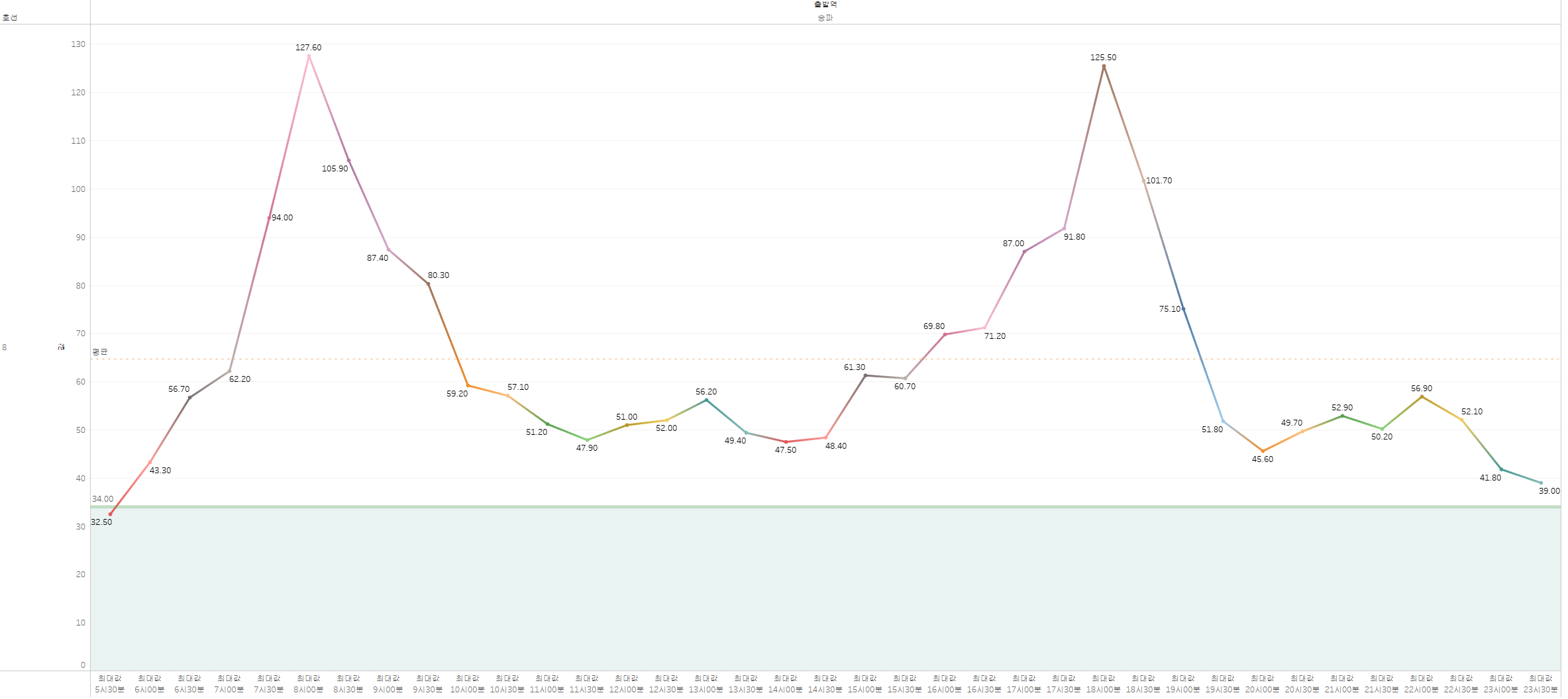 - 평일: 상선 127.6%(8시00분), 하선 103.9%(8시00분)
