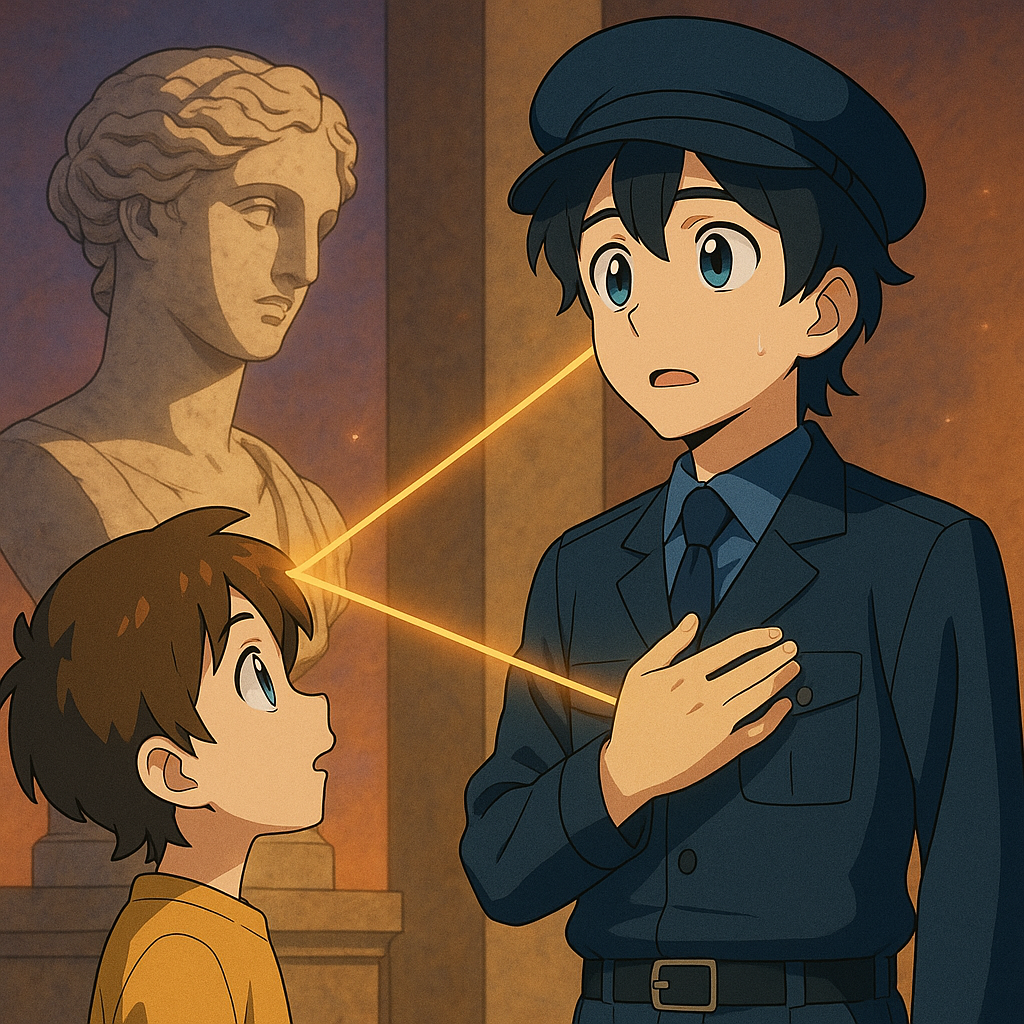 작품은 바로 그런 일상의 질감과 닿아 있을 때 살아난다. 경비원은 그 접속의 문지방에서 조용히 기다리고, 관람객은 자신의 이야기 한 조각을 작품 위에 올려둔다. 삼각형은 그래서 언제나 열려 있고, 그 열린 각도만큼 새로운 해석이 유입된다.