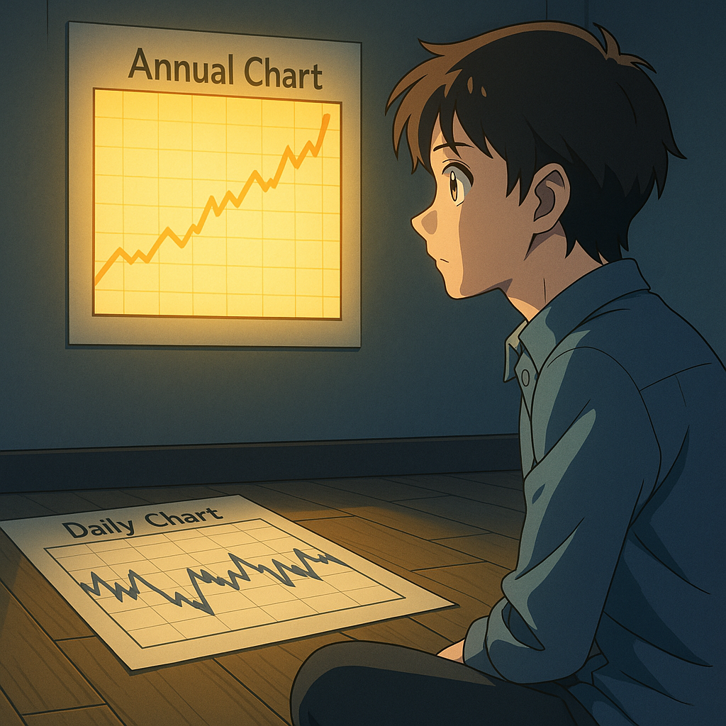 - 주식 일간 차트 대신 연간 차트 보기: 관측 주기를 바꾸면 감정의 분산이 줄어든다. 가능하다면 월간, 분기 단위 차트도 비교하여 큰 흐름을 익힌다.