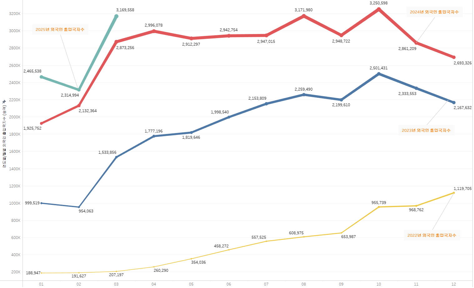 2025년 초기 데이터를 분석해보면, 외국인 입국자 수는 전년 대비 지속적인 증가세를 보이고 있습니다. 특히 3월 약 156만 명의 입국자는 이전 최고치인 2024년 8월(약 153만 명)을 넘어선 수치입니다.